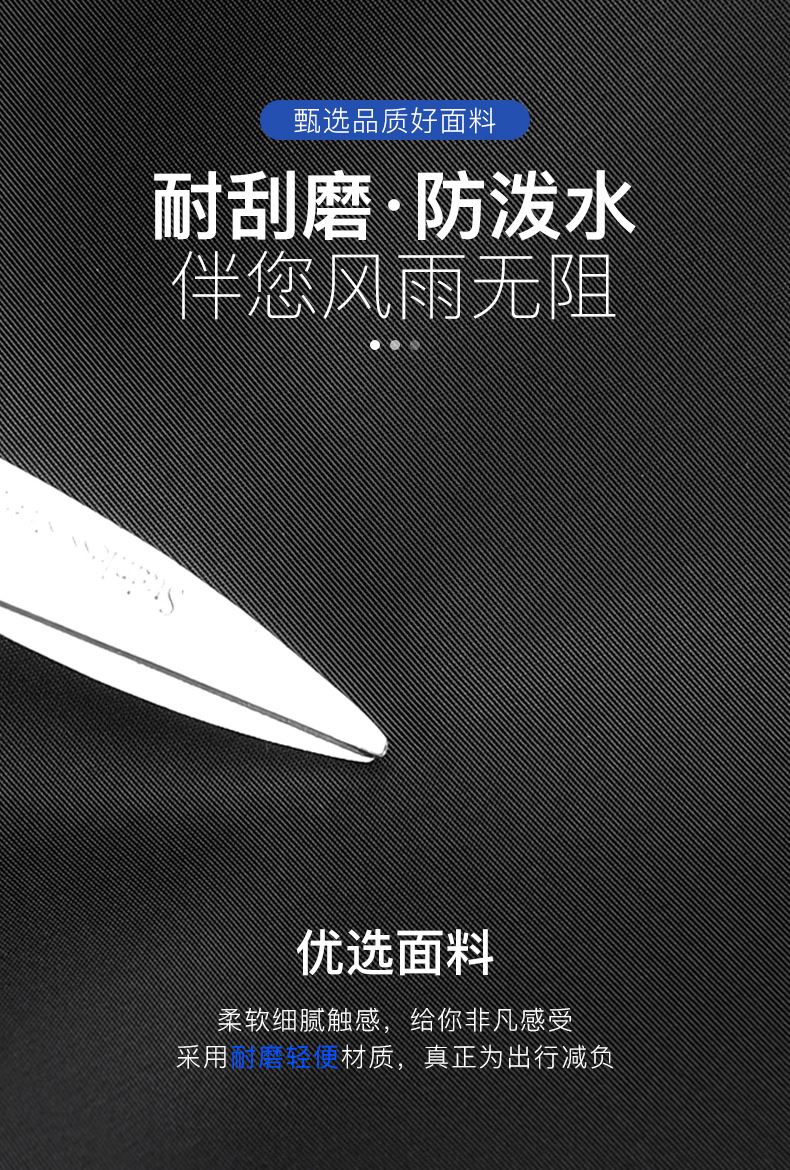 貨號: 2180 規(guī)格:45*30*12cm 顏色:黑色/灰色/藍色 ★主面料:防潑水織物,里料:滌綸 ★雙向防滑拉片,防潑水主面料 ★內(nèi)部隔層清晰,電腦專用放置隔層 ★三明治透氣背部,緩解背包燥熱。拉桿箱插帶設計,方便出行 ★設計時尚大方、簡潔,可以通勤,也可以休閑 ★外接USB充電口設計,更方便您出行給電子設備充電