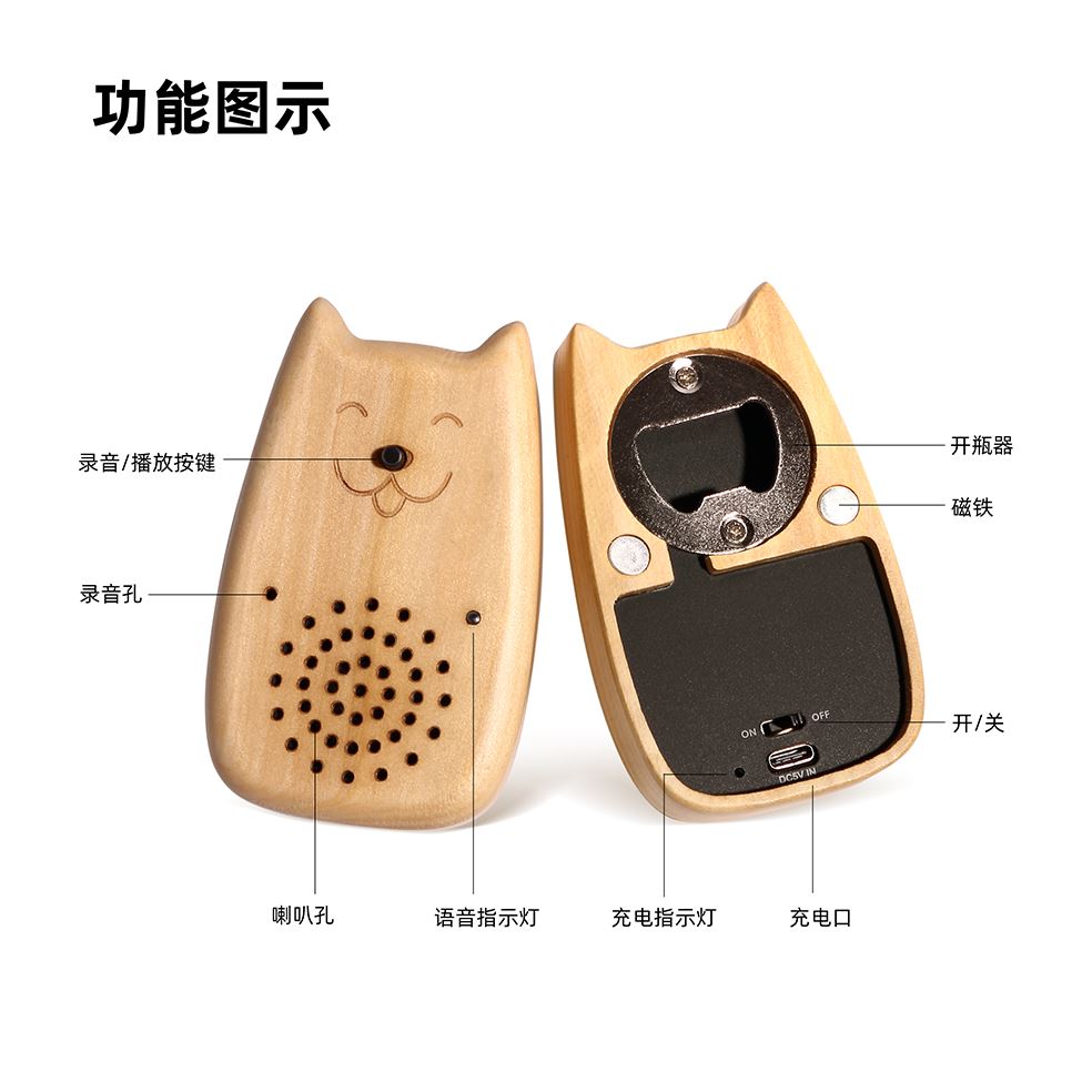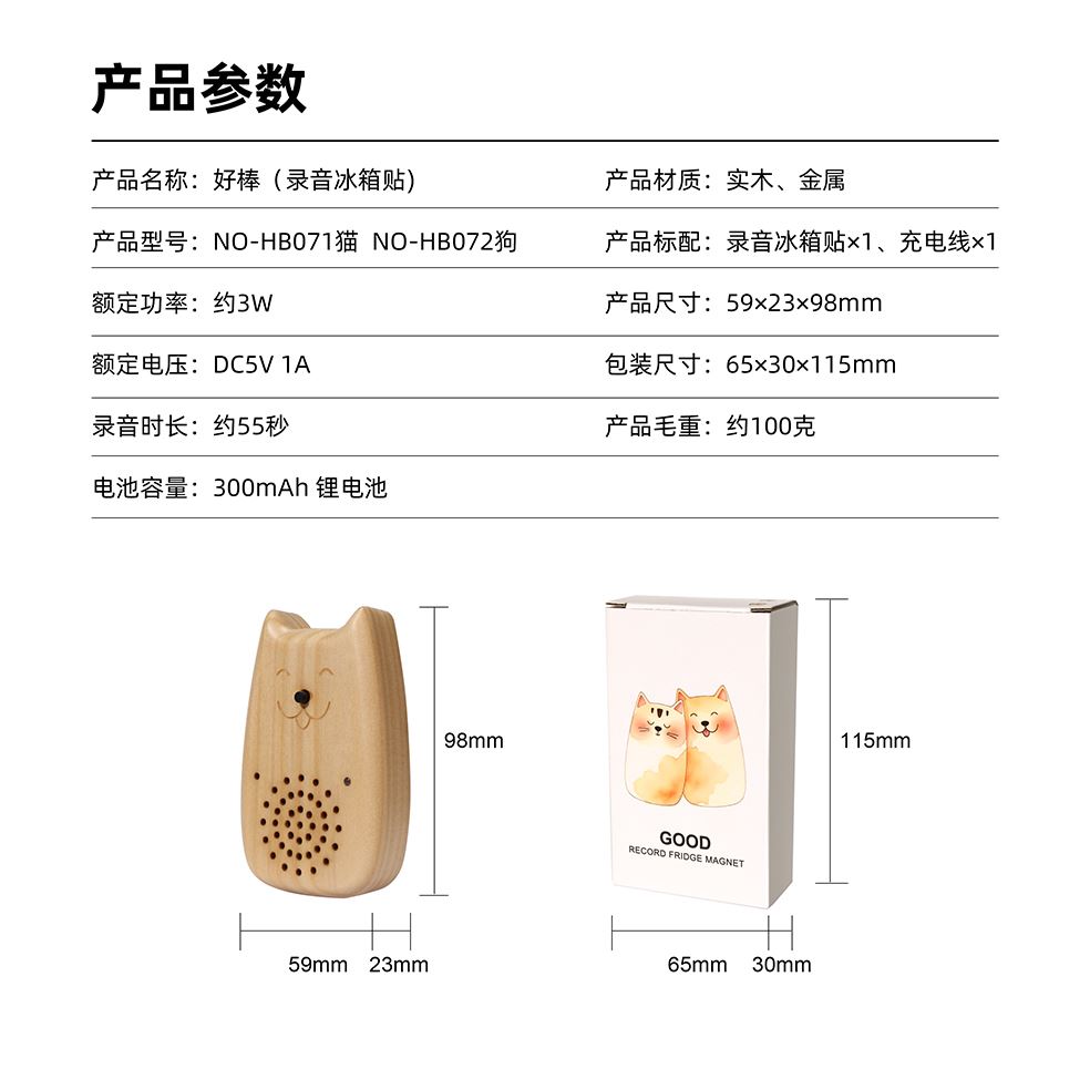 錄音冰箱貼 產(chǎn)品型號:NO-HB071貓 NO-HB072狗 額定功率:約3W 額定電壓:DC5V1A 錄音時長:約55秒 產(chǎn)品材質(zhì):實木、金屬 產(chǎn)品標配:錄音冰箱貼*1、充電線*1 產(chǎn)品尺寸:59*23*98mm 包裝尺寸:65*30*115mm 產(chǎn)品毛重:約100g 電池容量:300mAh 鋰電池