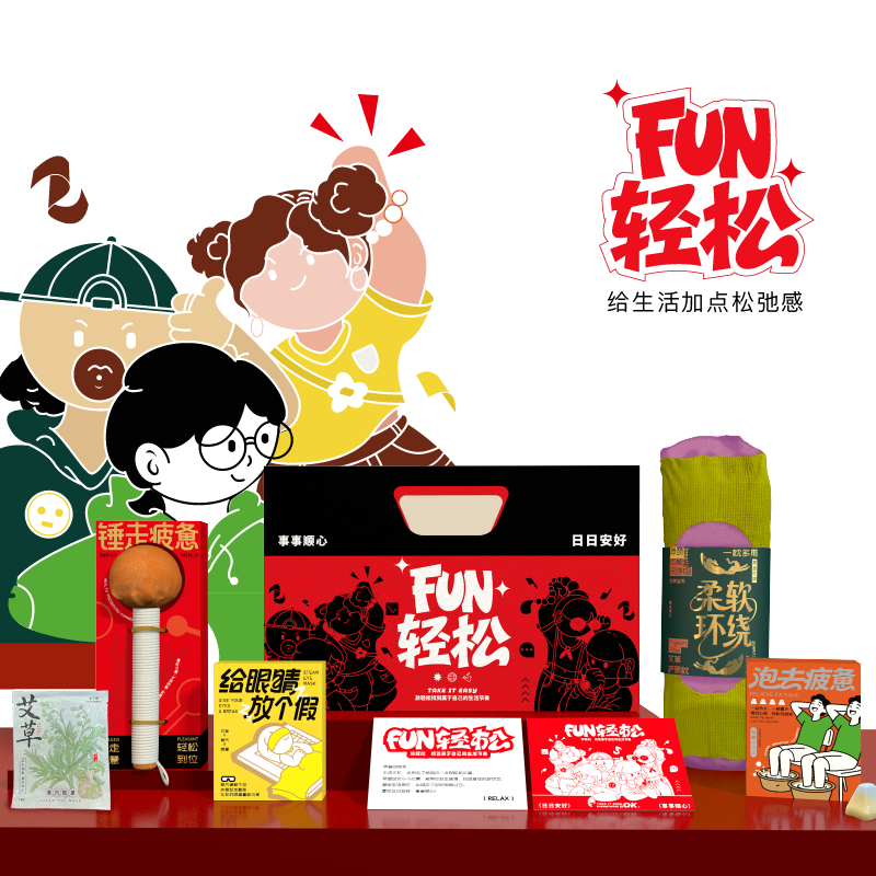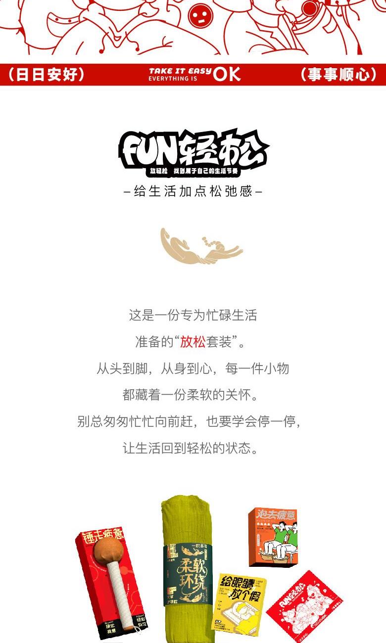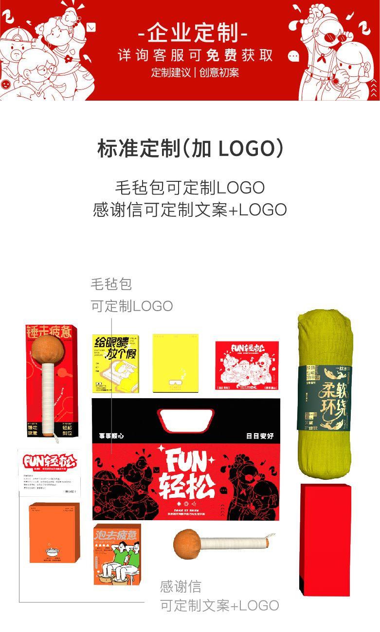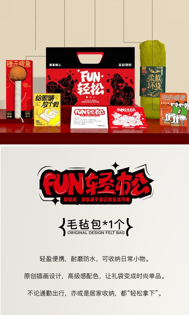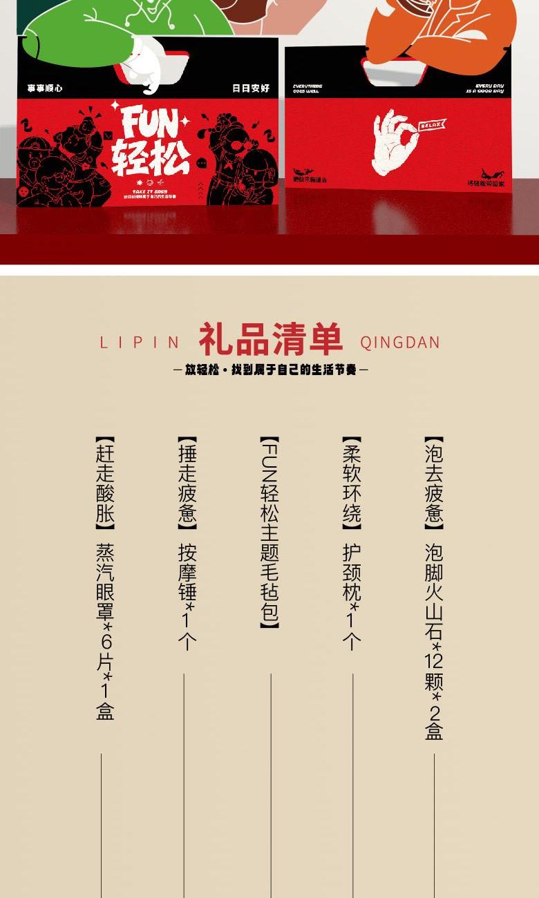 【FUN輕松主題毛氈包】 1、[捶走疲憊]按摩錘*1個(gè) 2、[柔軟環(huán)繞]護(hù)頸枕*1個(gè) 3、[趕走酸脹]蒸汽眼罩*6片*1盒 4、[泡去疲憊]泡腳火山石*12顆*2盒