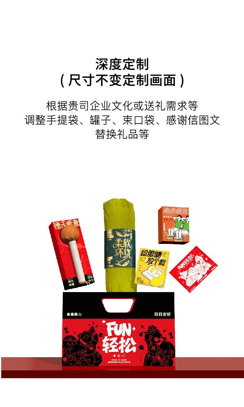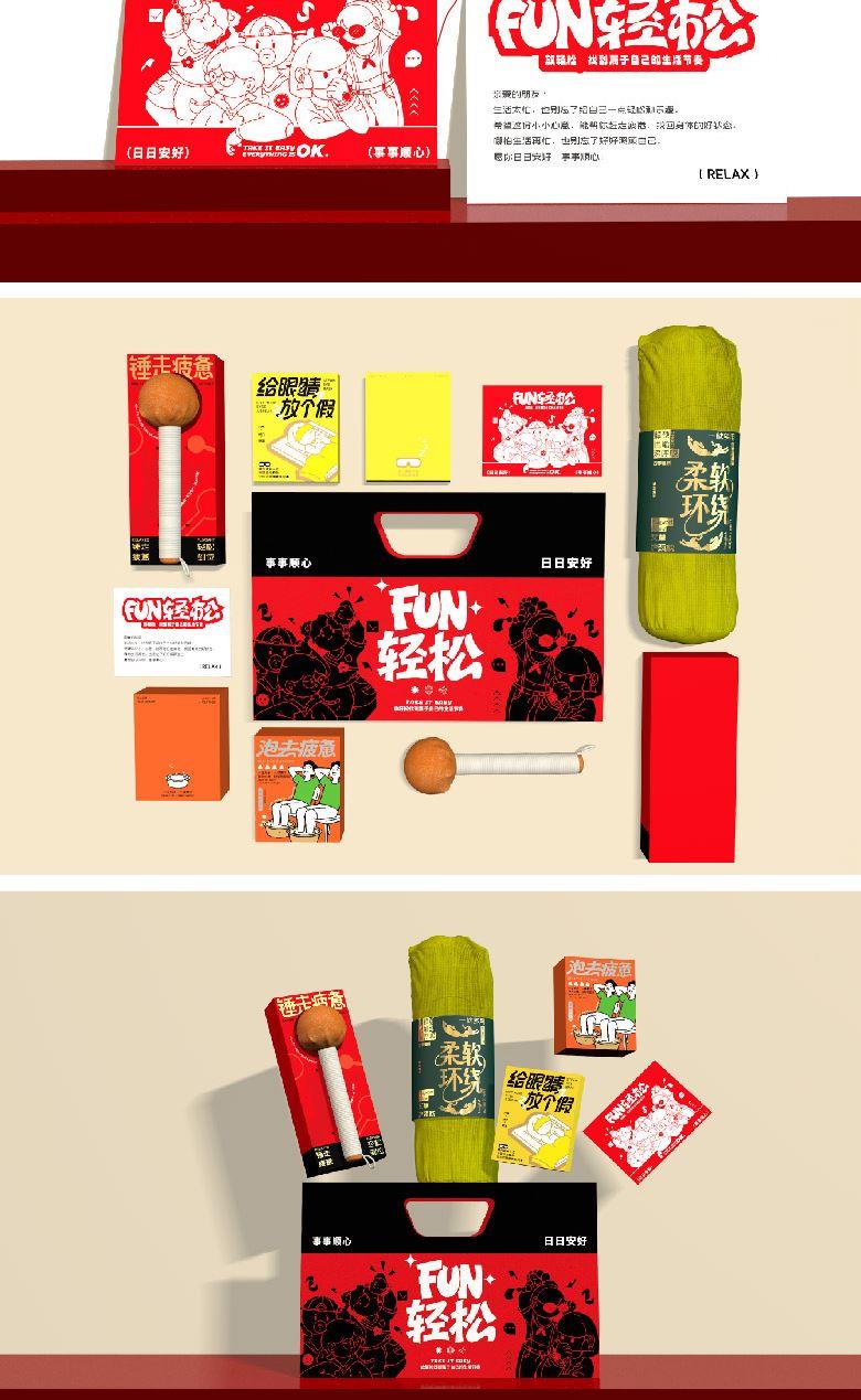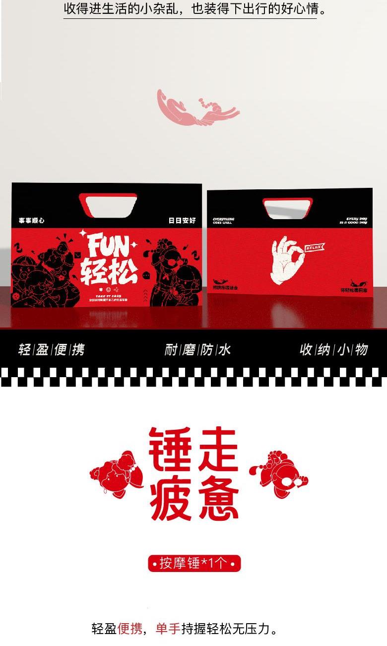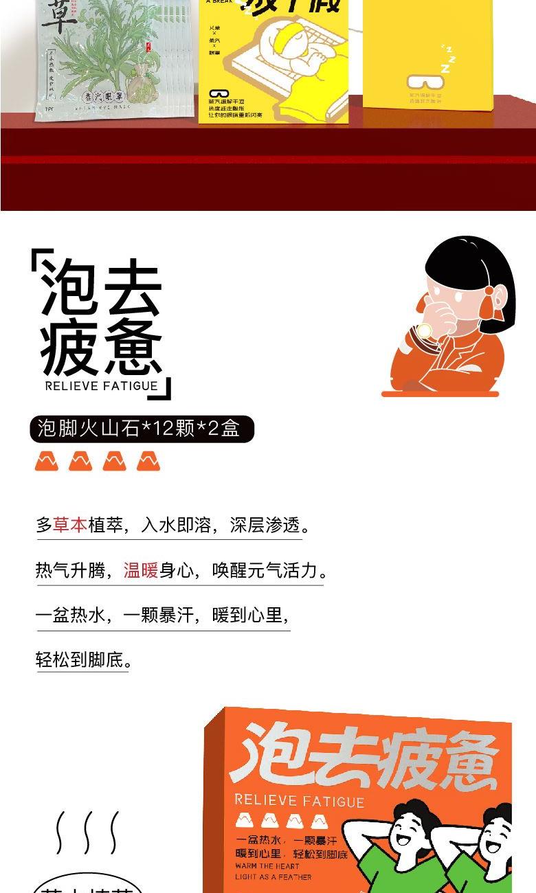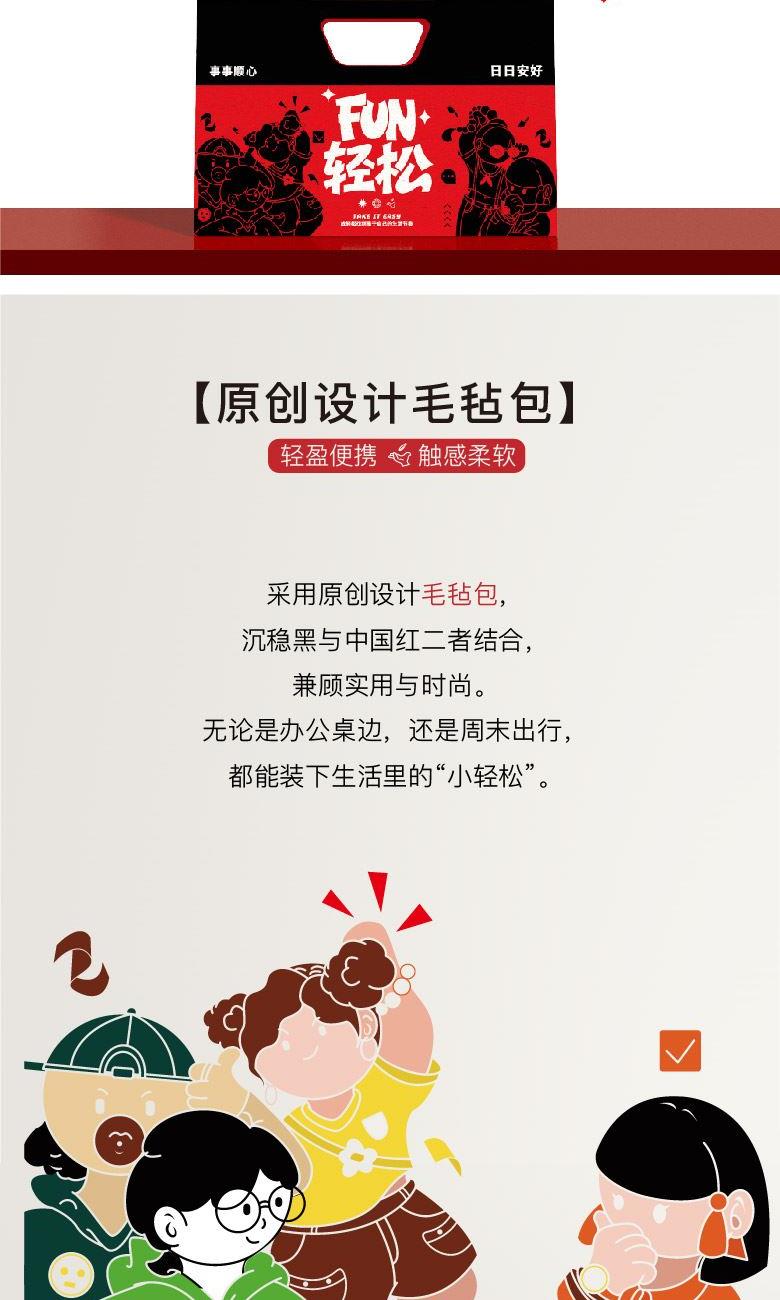 【FUN輕松主題毛氈包】 1、[捶走疲憊]按摩錘*1個(gè) 2、[柔軟環(huán)繞]護(hù)頸枕*1個(gè) 3、[趕走酸脹]蒸汽眼罩*6片*1盒 4、[泡去疲憊]泡腳火山石*12顆*2盒