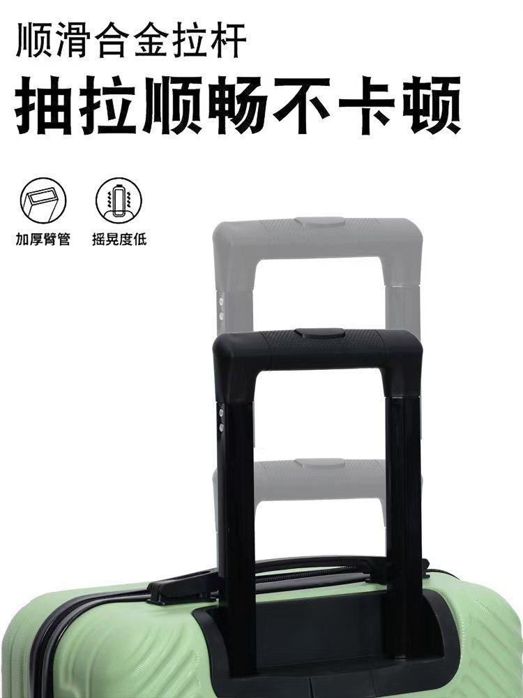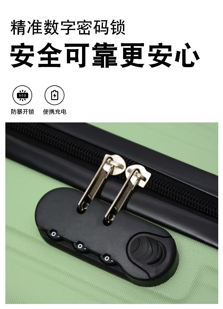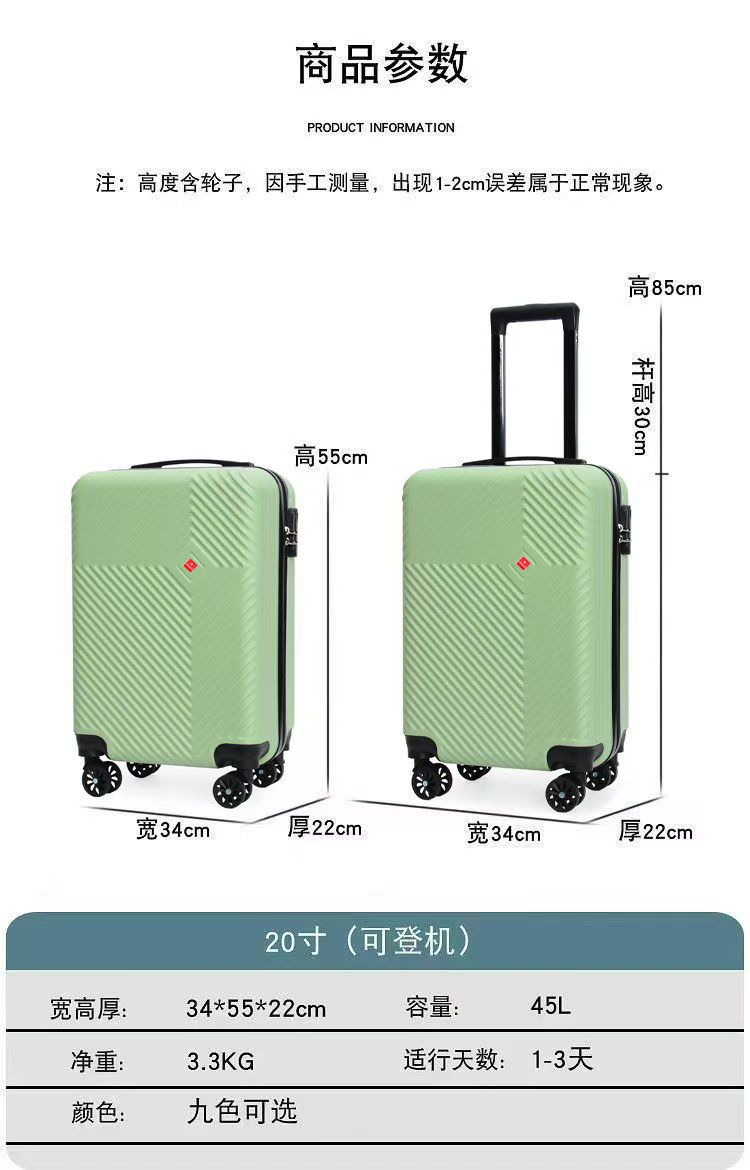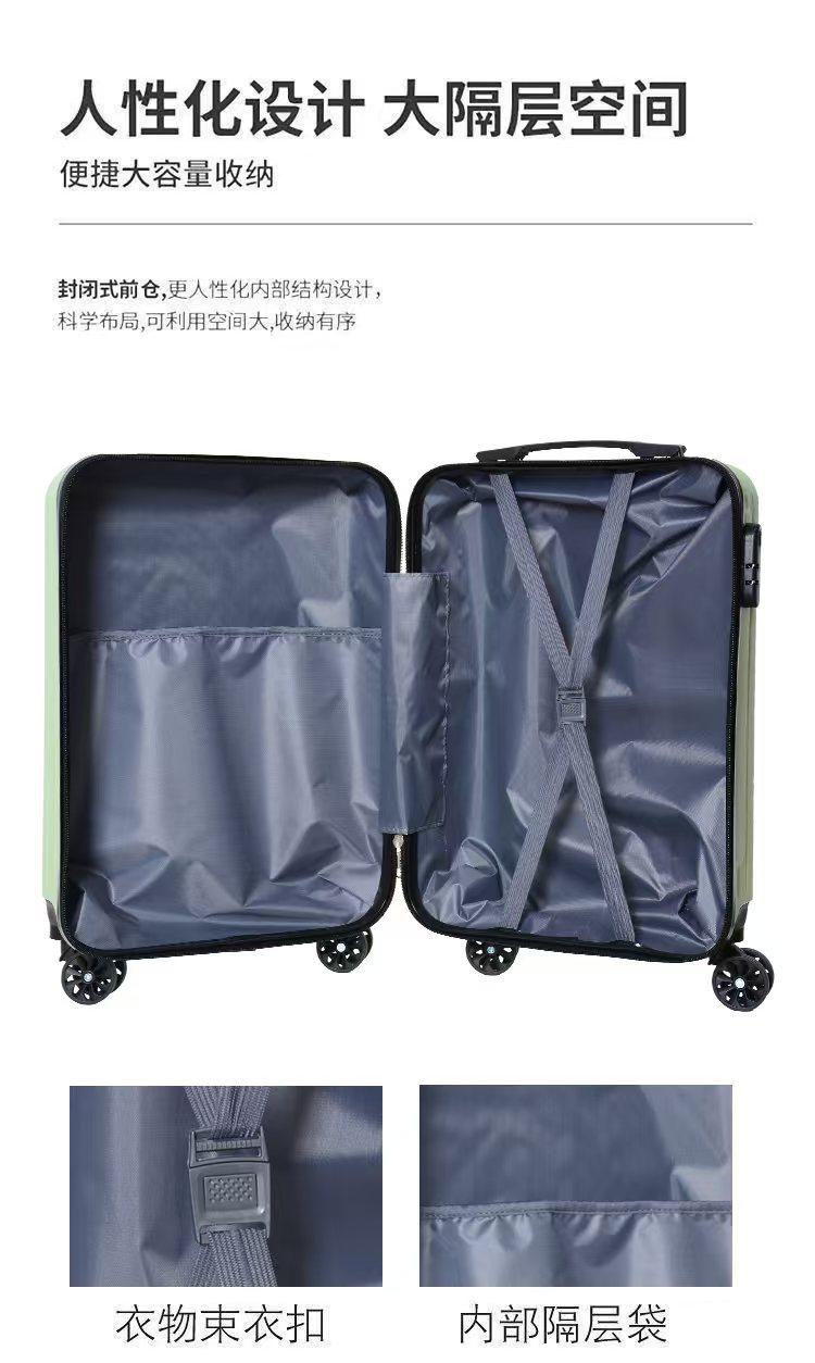 貨號: 7917 規(guī)格:50*36*23cm 顏色:藍色/黑色/粉色/綠色/玫瑰金 ★主面料:ABS+PC,里料:滌綸 ★時尚的外觀設計,拉桿箱一體密碼鎖,方便更加保障您的行李安全 ★ABS+PC材質,牢固、輕便,為您的出行省力, ★專業(yè)的內部隔層設計,方便您放置您的出行衣物和物品清晰 ★360度旋轉靜音輪,保障拉桿箱可以往任意方向行進