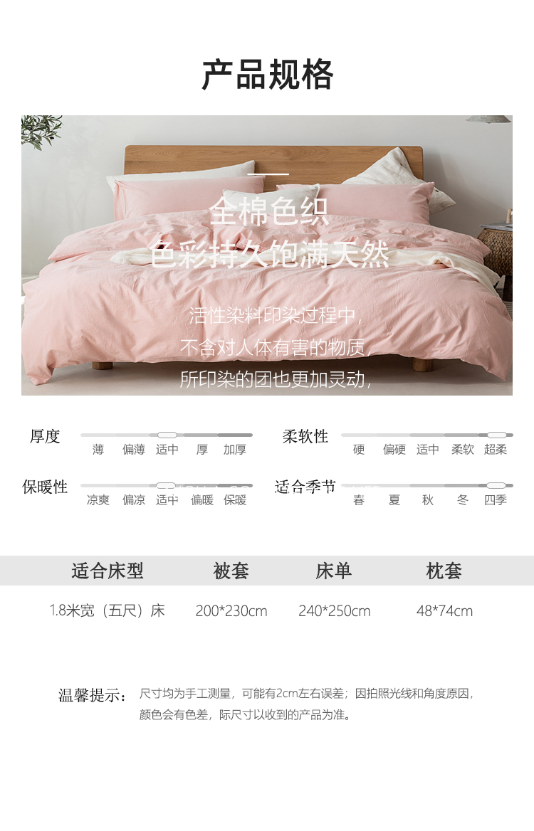 產(chǎn)品編碼:JLY25704 產(chǎn)品規(guī)格:被套200*230cm 床單 240*250cm 枕套48*74cm*2 面料材質(zhì):棉(色織水洗) 凈 重:2.9kg 禮盒 尺寸:420*320*95mm