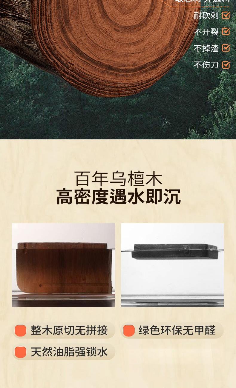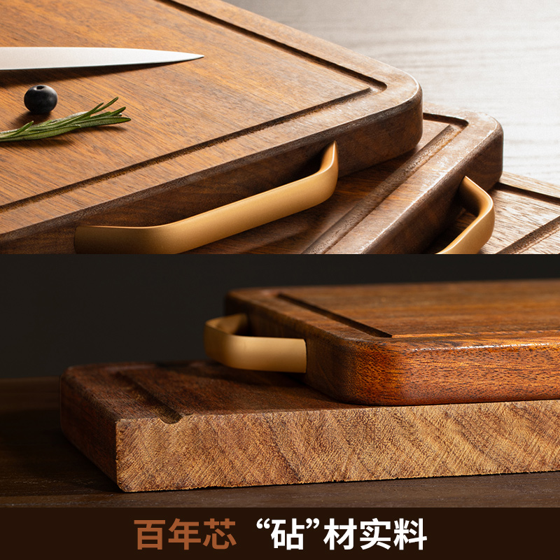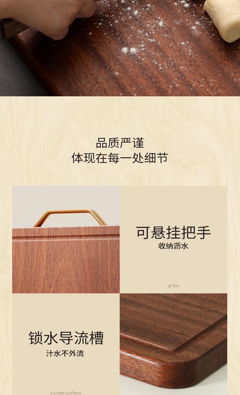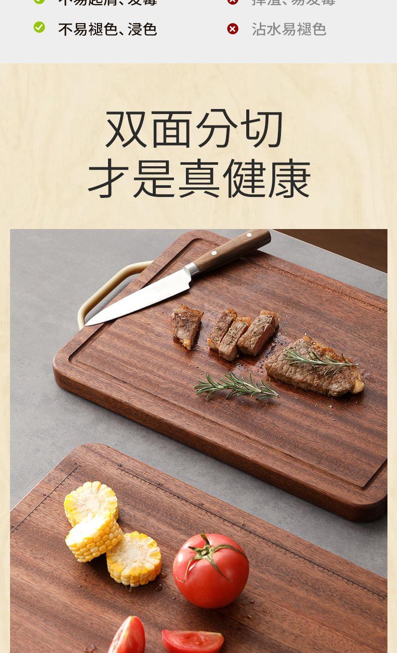 "無漆無蠟·耐砍耐剁 甄選烏金檀整木芯材 耐砍剁 不傷刀 不易開裂·雙面分切才是真健康可懸掛把手 收納瀝水鎖水導(dǎo)流槽 汁水不外流"