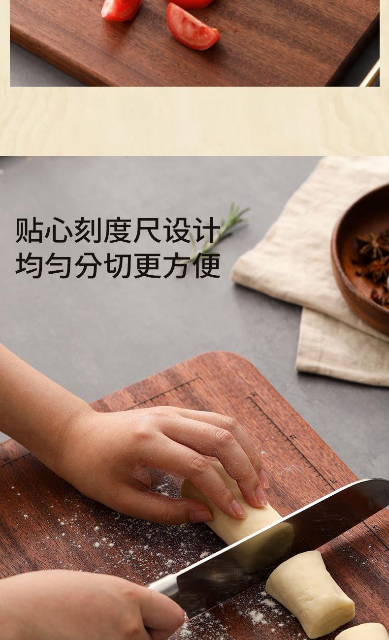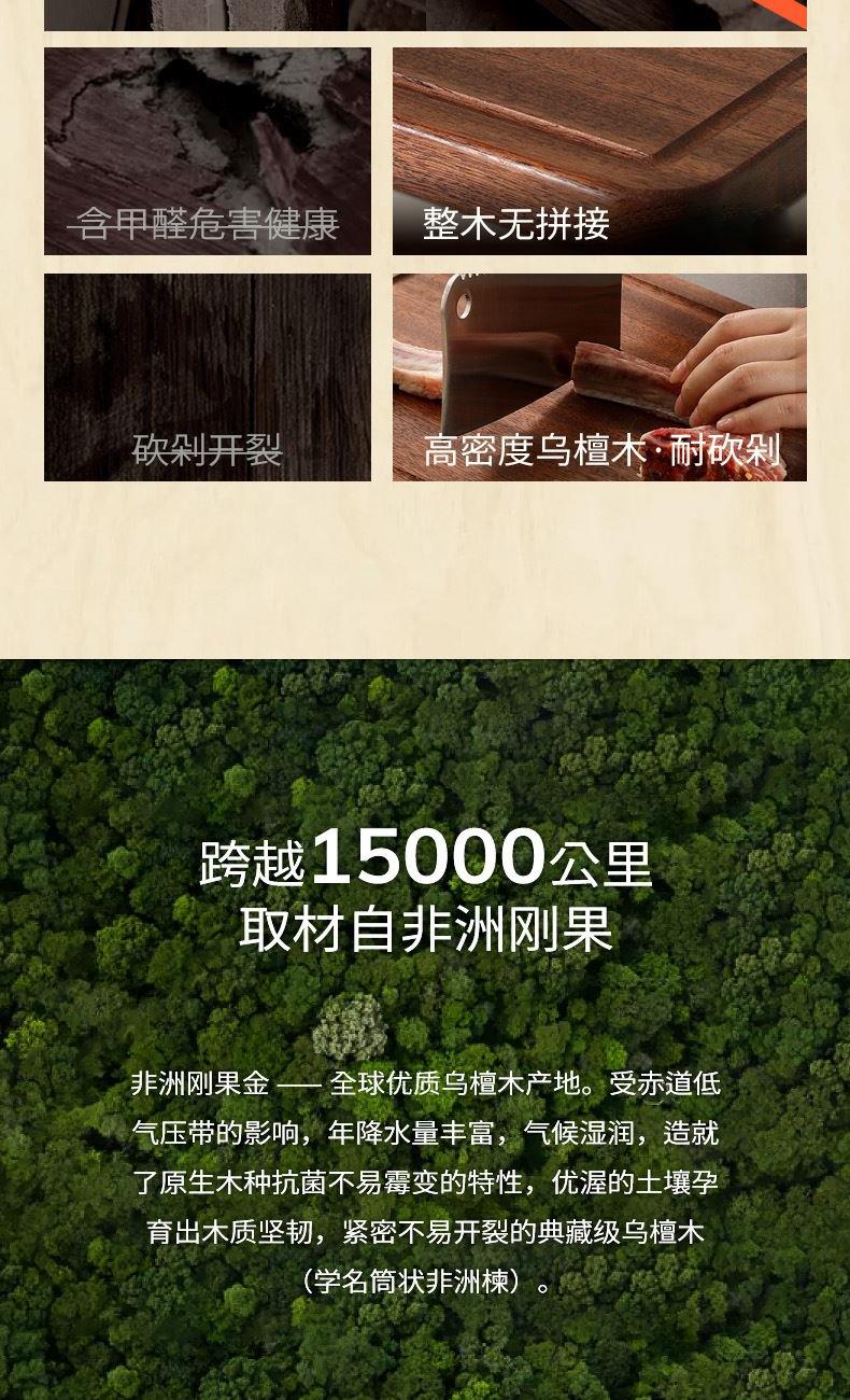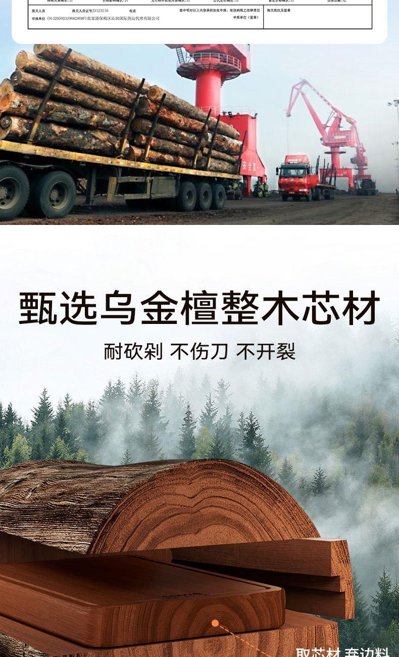 "無漆無蠟·耐砍耐剁 甄選烏金檀整木芯材 耐砍剁 不傷刀 不易開裂·雙面分切才是真健康可懸掛把手 收納瀝水鎖水導(dǎo)流槽 汁水不外流"