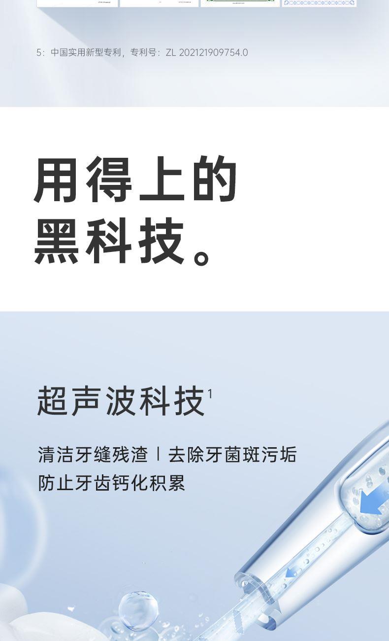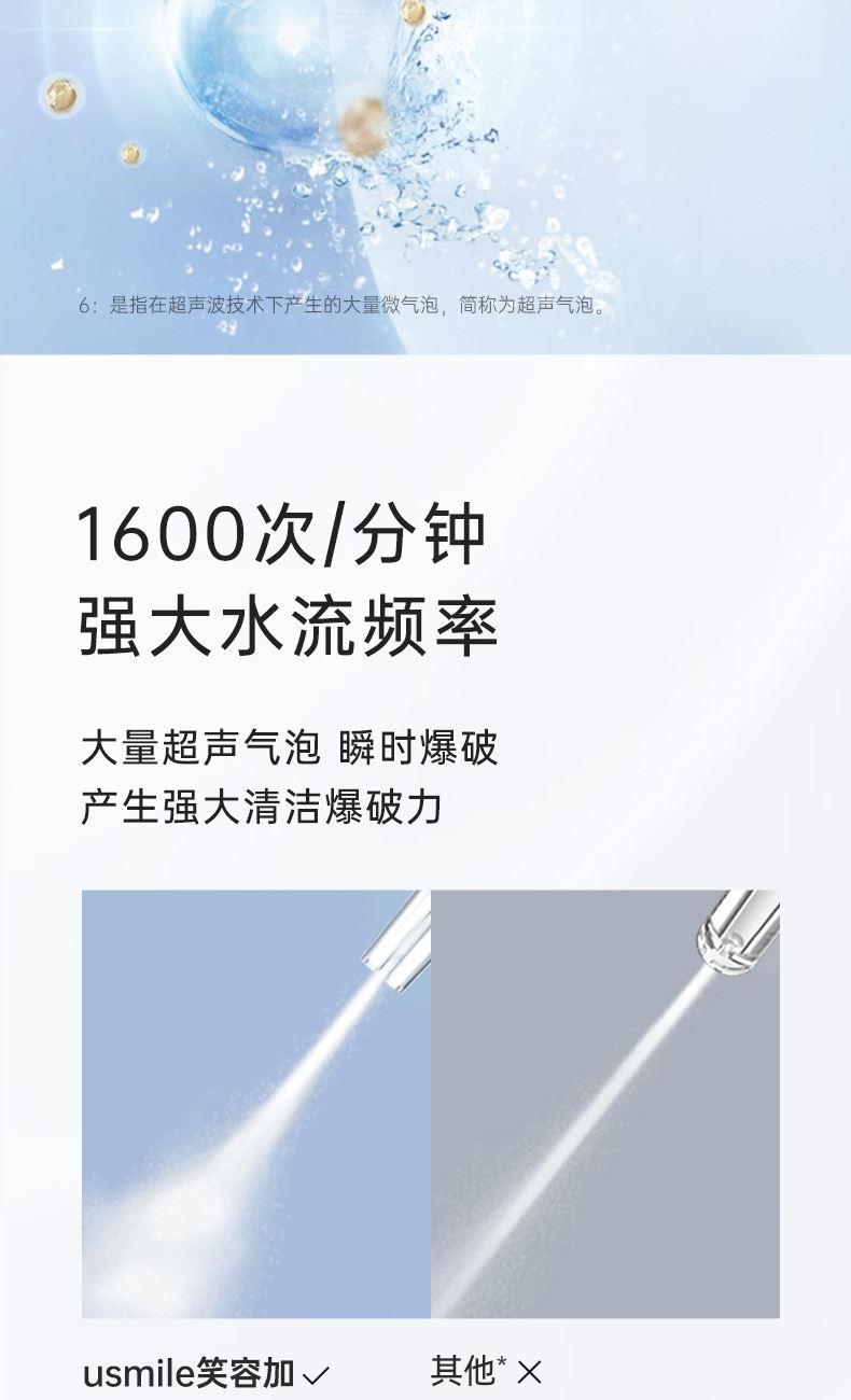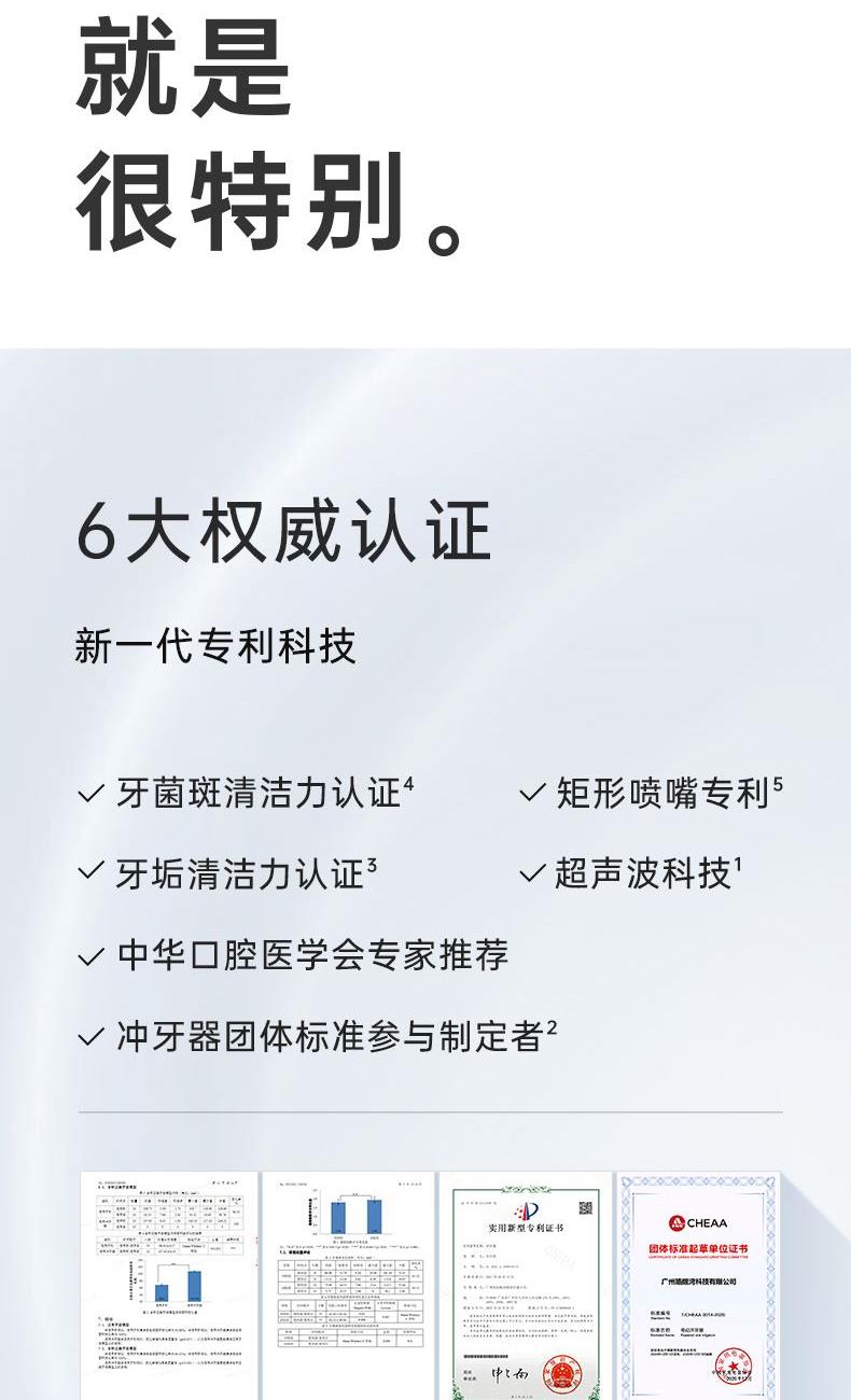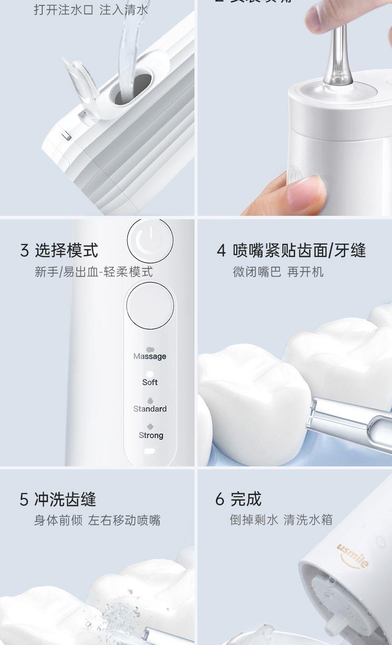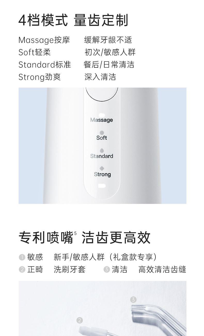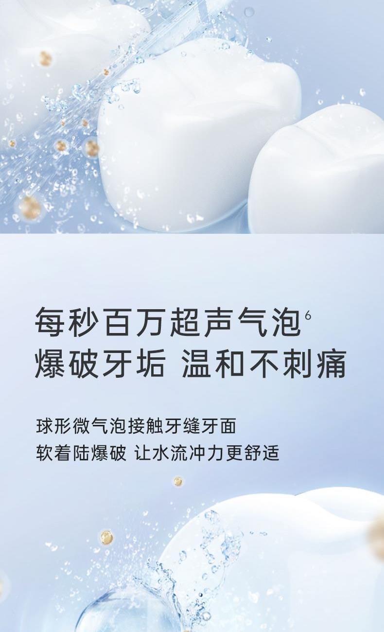 三大核心賣點(diǎn): 每秒百萬氣泡 爆破牙垢 溫和不刺痛 聚能噴嘴,凈澈齒縫 充電一次,續(xù)航90天,長待機(jī)守候 其它賣點(diǎn): 量齒定制,4種潔齒模式 3秒漸強(qiáng),力度漸強(qiáng)好適應(yīng) 雙開口設(shè)計(jì),注水清潔好方便 IPX7級防水,全機(jī)身可水洗