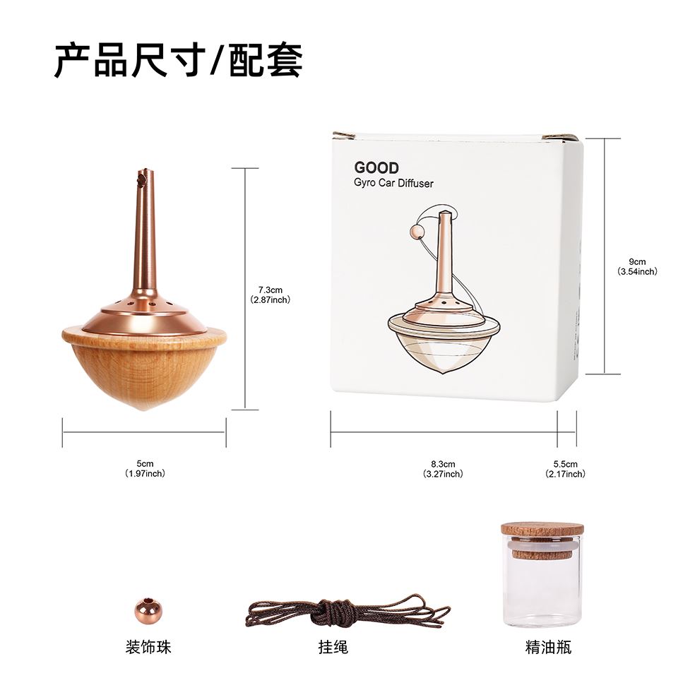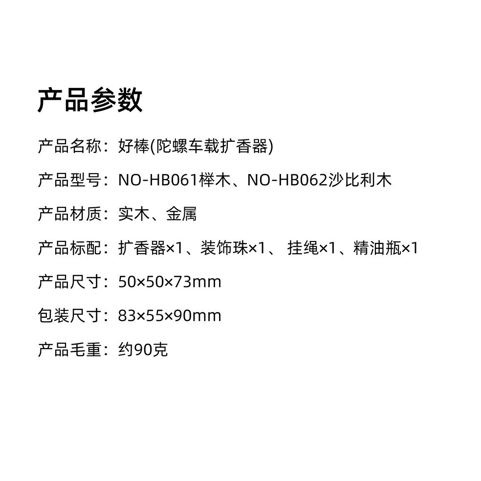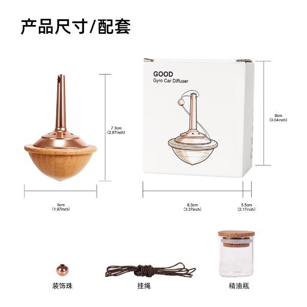 陀螺車載擴(kuò)香器 產(chǎn)品型號:NO-HB061櫸木、NO-HB062沙比利木 產(chǎn)品材質(zhì):實(shí)木、金屬 產(chǎn)品標(biāo)配:擴(kuò)香器*1、裝飾珠*1、掛繩*1、精油瓶*1 產(chǎn)品尺寸:50*50*73mm 包裝尺寸:83*55*90mm 產(chǎn)品毛重:約90g