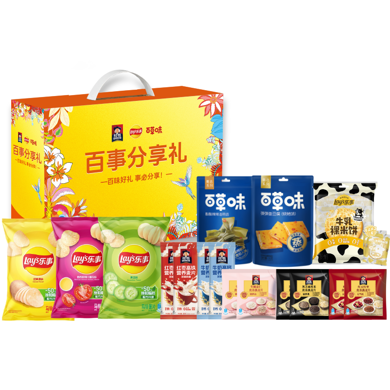 樂事薯片40g*3包(口味隨機) 桂格黑芝麻黑米食養(yǎng)燕麥片30g*2 桂格紅豆紅棗食養(yǎng)燕麥片30g*2 桂格生椰薏仁食養(yǎng)燕麥片30g*2 桂格牛奶高鈣燕麥片30g*2 桂格紅棗高鐵燕麥片30g*2 樂事牛乳裸米餅 60g *1 百草味海帶結80g*1 百草味魚豆腐75g*1